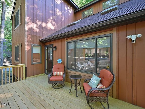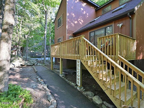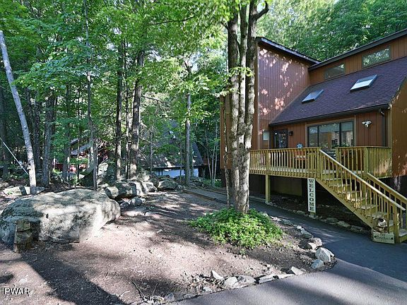 This beautifully updated home with guest quarters is located on a private wooded lot on a quiet cul-de-sac in a four season amenity filled community in The Northern Poconos, just two hours from NYC and Philadelphia Areas. You will relax once you walk through the door, the home is light and bright, high ceilings, modern fixtures, modern kitchen with high end appliances, upgraded tiled bathrooms, wood floors, sunroom with a free standing propane fireplace. Loft overlooking the living room can be used as a 5th sleeping area. The upper level has a large master bedroom suite. The lower level has a 2nd kitchen, bedroom and bathroom. Great for guests! There's also a one car garage. New front deck and paved driveway. Private setting.