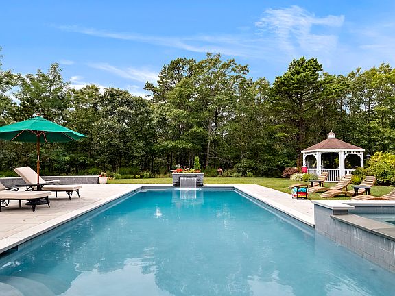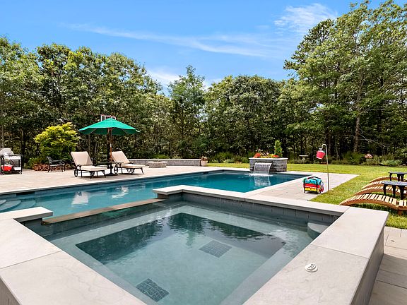Gardens with ornamental trees, evergreens, flowers, and well-manicured landscaping surround the home. The impressive, open 3,800-square-foot interior features grand living spaces with top-of-the-line amenities and furnishings, with an additional 1000-square-foot finished basement. Natural light fills the airy space, illuminating the pristine hardwood flooring and crisp white walls. Relax in the two-story great room with sliding glass doors leading out to the back, plush blue furniture, a cozy fireplace, and a flat-screen TV. Whip up a hearty brunch in the spacious kitchen equipped with stainless steel appliances, granite countertops, and blue cabinetry. Sip a cup of home-brewed coffee made in the Keurig and read the morning paper at the counter area with six bar stools. Share a meal at the casual dining table next to the kitchen or in the formal dining room containing an eight-person table. The office-library is equipped with computer monitor, keyboard and printer, and separate TV for those needing to connect to work. During the evening, the library converts into a 1920s style saloon for entertaining with a connecting bar area, a four-person high table and wine fridge. In the finished basement with hardwood floors, watch a movie or the game in the theatre corner equipped with 85" screens and surround sound, or play a friendly game of pool, ping-pong, and foosball. You can also shoot hoops on the basketball net in the backyard. Work up a sweat before your day begins in the basement fitness area featuring a treadmill, stationary bike, weight training equipment, and a yoga mat to do a self-directed yoga class. In the music corner, strum up a tune with the guitar or keyboard. Play pleasant background music throughout the day using the Sonos speaker system. Entertain and unwind with family and friends in the massive, private backyard. Fire up burgers, brats, and veggies on the charcoal and gas grills in the small outdoor kitchen area, and enjoy on the bar accommodating six or on the patio furniture. Take a refreshing dip and float the day away in the large heated saltwater pool. Soak up the sun with a cold drink poolside on the eight lounge chairs. During the evenings, decompress in the adjoining 8-person spa under the stars. The immaculate lawn provides ample space to run around and play the many outdoor games provided. When you are ready to explore, take a scenic ride around the area on the four bikes, including two for adults and two for children. You are also a short drive away from spectacular Hamptons beaches. End the night with Smores around the gas fire pit. Drift off to sleep in the four spacious, colorful bedrooms, each with a TV and a full ensuite bathroom. The master suite boasts vaulted ceilings, a two-sided fireplace, and a 70" soaking tub. Exquisite in East Quogue offers an unforgettable getaway you will never forget.