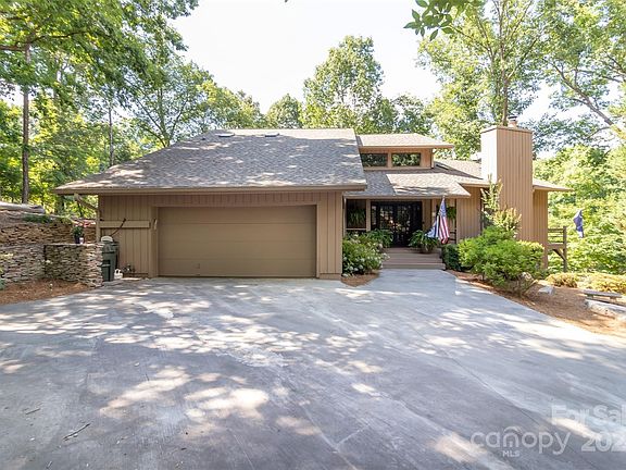 SELLERS ARE OFFERING A $20,000 CONCESSION FOR BUYER TO USE HOW THEY LIKE, AND A HOME WARRANTY! Welcome to your mountain retreat in the lakefront community of River Hills, with one of the most private lots in the neighborhood - no neighbors on either side. The unique & special home offers 5 bedrooms and 3.5 baths - with a primary suite on the main level AND upstairs! The wrap around, multi-level deck offers plenty of privacy & space while enjoying views of nature & the water. Living room boasts a large stone, wood burning fireplace & multiple doors leading out to the deck. Sunroom offers 3 season relaxation while surrounded by trees. This home packs plenty of unique features-a live edge island in the kitchen, heated floors in main level primary bath, two separate basements & two separate 2-car garages! The low maintenance lot has no grass to cut & stone steps leading down to the water. Exterior painted -2023, new roof -2022 with new skylights, & new sliding doors on main floor in 2023.