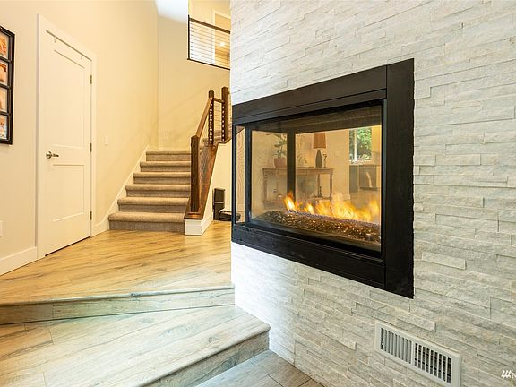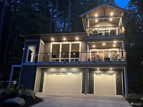 Walk into the entry of this Northwest Contemporary home, to a 3-sided gas fireplace, and a great room with floor-to-ceiling windows which opens to the large dining area and chef's kitchen featuring a large quartz island and walk-in pantry. Laundry room, large bedroom, and 3/4 bath complete the downstairs. Upstairs there are three more bedrooms one being used as a media room/office. The primary bedroom has a covered deck, a 5-piece ensuite with a freestanding tub & walk-in shower. Also, includes a rare 3-car garage & gigantic driveway as well as a usable sunny yard professionally landscaped with drought & deer-resistant plantings. All within the Sudden Valley community with golf, pools, trails, dog park, and private marina on Lake Whatcom.