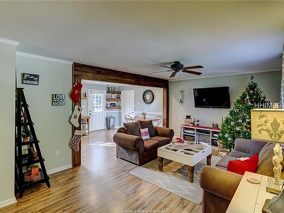 "Town meets Country" in this lovely 3 bed, 2 bath home located equal distance from Old Town Bluffton and Historic Beaufort. No POA fees, rules or restrictions! Country living w/large (1/3 acre) yard, oversized deck, firepit & privacy fence make this the ideal home to entertain and enjoy outdoor activities. The open-concept family room flows into the kitchen and offers ease of living. Nicely upgraded w/SS appliances, granite counters, modernized bathrooms with butcher block tops, shiplap, large utility/laundry room and new flooring throughout. The master bedroom has updated master bath with walk-in shower and rainfall showerhead.