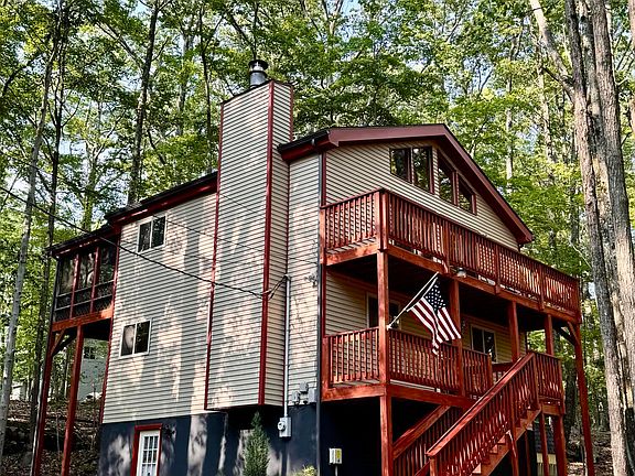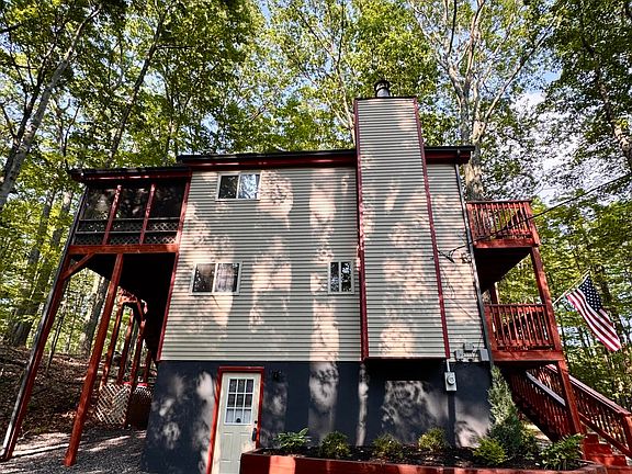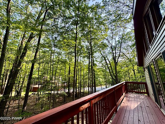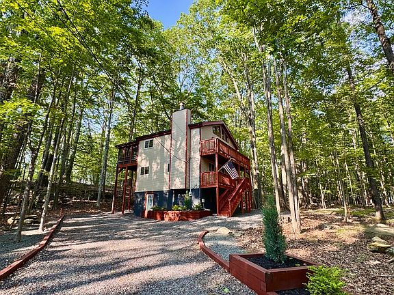 Welcome to this beautifully maintained 4-bedroom, 3-bath home in The Hideout , an amenity-filled community in the Poconos. With balconies on every level, you can enjoy your morning coffee surrounded by nature. The main living area is on the top floor, maximizing natural light and tree-top views and a screen porch for lounging and entertainment. Featuring a newly landscaped driveway, a freshly power-washed exterior, and a newer roof, this home is ready to enjoy year-round. Perfect as a full-time residence, vacation home, or investment property!