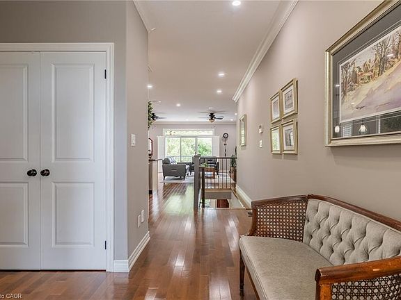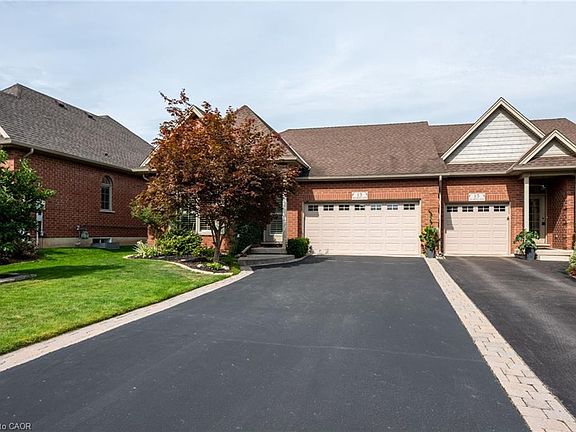 Located in a highly sought-after area of Caledonia, this spacious end-unit bungalow townhome offers 1434 sq. ft. of beautifully designed main level living. The bright and open layout with 9-foot ceiling features a custom kitchen with granite countertops, seamlessly flowing into a generous living area with oversized sliding doors leading to an upper-level deck overlooking a serene park like setting, and is complete with a gas BBQ hookup. The main floor primary bedroom is filled with natural light from 2 windows, complete with a walk-in closet and private 3 piece ensuite. Plus enjoy the convenience of main floor laundry. The lower level expands your living space with an additional 1,416 sq. ft., featuring a cozy gas fireplace, a large recreation room with ample natural light from its window and sliding doors, a third bedroom, a 4piece bathroom, and plenty of storage. Step outside to enjoy the walkout patio, a 195ft deep landscaped yard, custom water features, and newly installed composite decking - perfect for relaxing or entertaining. Additional highlights include a two-car garage and a driveway with parking for four more vehicles, California shutters throughout, and a built-in ceiling speaker system for premium sound. Plus, enjoy peace of mind with updated mechanicals, including a new furnace, air conditioner, and water heater, all replaced in 2020. Dont miss this exceptional home in a prime location!