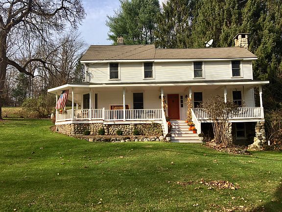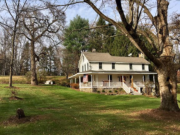 Welcome to 13 Iron Forge Road in Warwick, a stunning farmhouse colonial which ties together old world charm with modern amenities and is situated on a picturesque country road in the hamlet of Bellvale. This beautiful home features gorgeous stone work and wrap around porch that welcomes you in. You'll notice many original hardwood floors, well appointed country kitchen with wood burning stove, pantry, stainless appliances and granite counters. Also on the first floor is an updated powder room, two family rooms, one with working fireplace, and a formal dining room. The second floor provides 3 guest bedrooms, a generous sized bath with double vanity, and master bedroom with loft. Large 3 car detached garage provides numerous possibilities with second floor workshop along with separate office/studio. The 4.8 acres provide fenced in gardens with raised beds, chicken coop, and mature landscaping. Enjoy picking berries and apples as well as tapping a sugar maple right in your backyard! Many upgrades are included and this home is situated in an excellent commuting location and just minutes to wineries, breweries, library, and Warwick's charming Main Street.