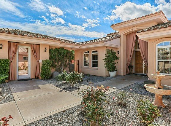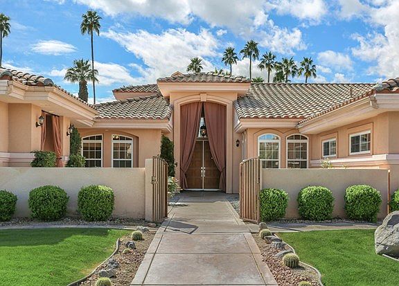 LOCATION, PRIVACY, ELEGANCE. In the exquisite, gated, Ivy League Estates, in the heart of Rancho Mirage. This welcoming home is minutes away from The River for dining and shopping, and the famous El Paso Shopping District. It is only a few blocks from the Eisenhower Medical Center. Assumable, leased solar system installed, on the backside of the roof. The charming courtyard entrance to the home includes beautiful roses and fountains. This spacious and open Great Room floorplan includes 4 bedrooms (two master suites with walk-in closets and built-ins. Each bedroom has its own bathroom and private door to the outside/backyard. A well-appointed eat-in kitchen, and a separate formal dining room. A bonus room with built in bar to serve as family room or can be easily transformed into a spacious media room. This North facing beauty includes desert landscaping as well as lush green hedges, fruit trees, and mature trees. A corner lot, with on property parking for up to nine cars, and plenty of street parking. Too many upgrades to list This home hosts a cozy detached casita, with full bath, and loads of built-in cabinets, to be enjoyed by guests or used as an office and features its own private entrance. One of the largest models available in the development. Generous built in storage inside the triple car garage. This home has been well maintained. Offer acceptance comes with a full inspection report-2/15/21, and HOA docs- immediately, Platinum Home Warranty paid by Seller.