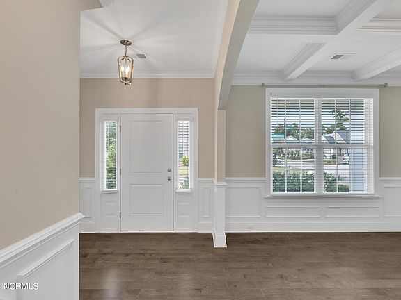 This stunning, quality-built home blends timeless elegance with modern comfort, nestled in the heart of Hampstead in an active and desirable community just minutes from the beach. The welcoming foyer leads to a flowing layout connecting kitchen, dining and living areas- ideal for entertaining. Hardwood floors span the main living spaces, while a gas fireplace adds warmth and style. The gourmet kitchen is the heart of the first floor, featuring white cabinets with crown molding, granite countertops, a gray tile backsplash, stainless steel appliances (including a gas range), a large center prep island, corner pantry, and a butler's pantry for additional storage and prep space. Also downstairs you will find a cozy built-in nook, ideal for a play space or pet retreat.