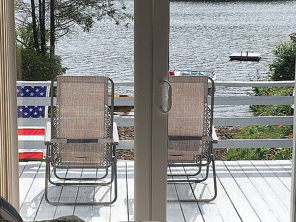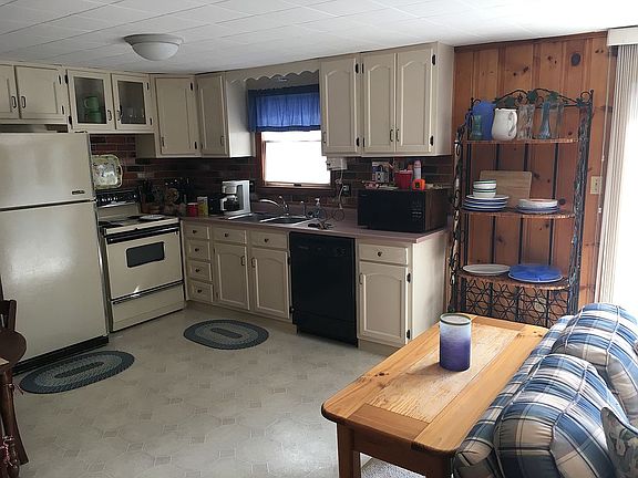 Cool waters await you in this fantastic Waterfront getaway. 50' of lake frontage - full recreational lake. Level lawn area leads to your own sandy beach. Spacious eat-in kitchen,open floor plan. Gorgeous views of lake.Triple sliders open to deck spanning entire front of the house. Patio below provides cool shady spot & access to full basement. Three bedrooms, one full bath + small 1/2 bath in basement for run-in/run-out use. Electric heat - could be year-round home. Can be purchased furnished!