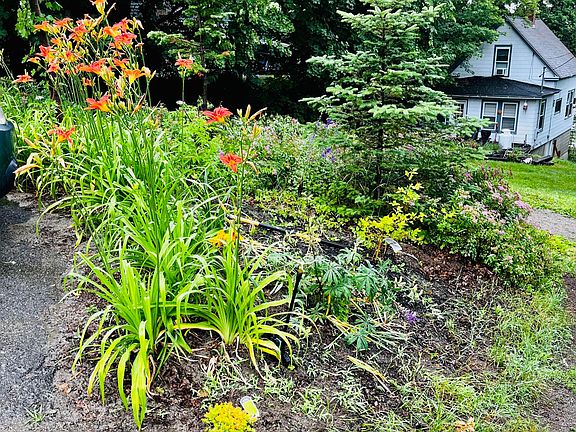 Current owners planted lots of beautiful flowers the in landscape the come up seasonally.