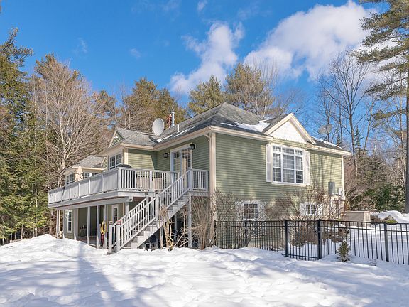 Follow the snow-topped pines around the curve of the private drive to this executive, elegant home overlooking a spacious, wooded lot abutting a cul-de-sac and hiking trails. Curiosity beckons to take a look inside beyond the thoughtful landscaping and inviting entrance. Enjoy desirable one level living with bright windows and gleaming cherry hardwoods in the open concept living room with cathedral ceiling and kitchen with counter seating and dining nook. A stately office with glass French doors, generous primary bedroom suite with walk-in closet, double sinks and tiled shower, and two additional bathrooms complete the first floor. Downstairs are two bedrooms with walk-in closets, a large entertaining space with wet bar, plentiful storage, and a full bath. Connecting both floors to create a cohesive flow outdoors is a two level deck, perfect for wildlife watching or evenings around a Solo stove. Minutes from award-winning schools, country clubs, shopping, and access to routes 295 and 95, this is an ideal location for those looking for balance in the convenience of being close to Portland with the calm of being surrounded by nature.