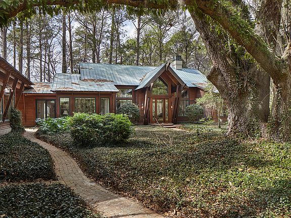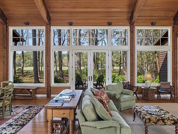 This charming residence, designed by Scott Corkern, is a comforting and livable retreat within a natural and pristine setting on 1.11 acres. The overall siting of the main house, guest house, and garage are situated around a massive live oak, providing a sense of balance and symmetry to the compound. The home is situated next to Iand encumbered by a conservation easement, ensuring privacy from your neighbors. The core of the home is a large living/dining area with high-beamed ceilings and wood paneled walls, all on one level. Large windows and French doors attract light and encourages flow between outdoor and indoor spaces. Features of the home include hardwood floors, antique brick fireplace, large beams, elevated ceilings, and custom built-ins. A generous kitchen with a center island and breakfast area is wonderful space for making memories. There is an office that provides an intimate space for family and friends to gather as well. In the main residence, the master bedroom features his and her closets with an ensuite bath . For guest accommodations, there is a charming guest house that offers two additional bedrooms and bath connected by a breezeway. The large rear brick patio with fire pit offers a peaceful view of the pastures and the location is perfect – just a walk or short bike ride to the central hub of Spring Island. With the proximity of the Stables, River House, Sports Complex, Nature Center and community docks, members’ of the family can enjoy their day as they please.