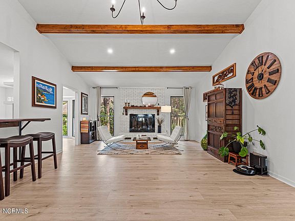 Owners are selling their newly renovated dream home after accepting a job offer in Italy. Located on a quiet Pinehurst street, it has been tastefully and fully updated in a modern, classic style. Everything is new and immaculate. A vaulted beamed ceiling, open concept living and dining room, light LPV flooring and central fireplace set the tone for the casual elegance and quality materials that permeate the home. A pass through with wood bar that can accommodate bar stools opens to the living room, allowing you to interact with guests while honing your culinary skills. Over-sized cabinetry, open shelving, quartz counters, higher end stainless appliances, pantry and breakfast area with bay window give you plenty of space and style. The owner's suite has a large walk-in closet, access to the laundry, double sinks with granite countertop and spectacular shower with glass door. Patterned tile flooring and matt fixtures add to the overall custom look, while the split floor plan allows for an easy living arrangement. Flowering gardenias and mature plants grace the fenced backyard. This serene neighborhood is perfect for walking your furry friends and enjoying a Pinehurst lifestyle. The all-season Carolina room is currently being used as an office. New HVAC 2023.