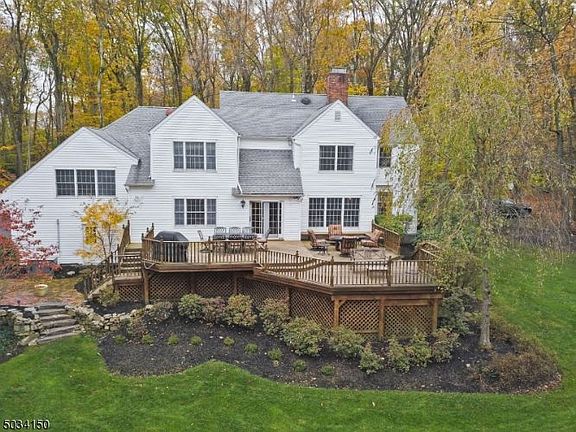 Classic Col 4Br 4.1Bths, on 2.7 level wooded acres. Sunny and bright- Freshly painted rooms. Chef's kitchen w Viking range, beamed ceiling, granite counters, brkfast bar, and custom cabs, great storage. Beautiful hardwood floors, w w carpet, 2 FP in LR and FR, and finished basement w rec room , cozy 2nd off den , and easy garage access stairs. The 2nd floor has 4Brs, 3 Bthrms, (lavish Master Bthroom) , exercise room, hallway of closets, and a spectacular home office with built-ins overlooking your wooded backyard oasis, perennial gardens and 20'x40' deck. Improvements include: whole house generator 2012, newer roof , A C , furnace , and hot water heater '19 . Highly rated Mendham Twp school system. Come see this beautiful home and all it has to offer