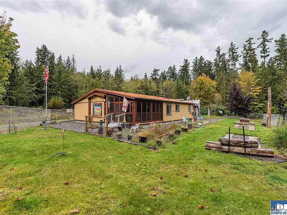Sequim living away from town, pristine & move-in ready. Newly painted inside & out and newly carpeted triple-wide is on 2.27 acres with a less than 5 year old metal roof. Sunny southern exposure. Hobbyist? The 1600 sq ft detatched garage/shop has 3 contained shops inside the main shop including a paint-room w/built-in exhaust fan, a woodstove and half bath. A 900 sq ft garage has a fully contained workshop w/workbench. Fenced garden offers many producing fruit trees. Wheelchair accessible. Original owner.