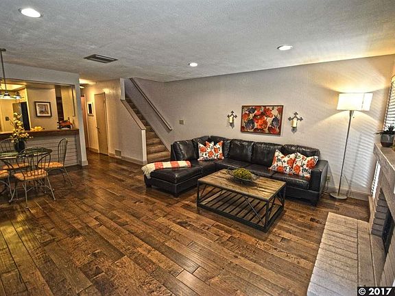 Open floor plan w/ upgrades throughout, engineered hardwood floors & custom interior paint. The living room is comprised of a brick surround gas burning fireplace w/ a raised hearth, recessed lighting, a slider that opens to the back patio & a cozy dining area w/ pendant lighting. Moderately updated kitchen offers abundant cabinets w/ granite countertops, a breakfast bar, a tray ceiling w/ newer light, stainless steel appliances & access to the garage. The downstairs half bathroom offers a newer vanity w/ a cultured & tile flooring. The master bedroom provides a walk-in closet, carpet flooring & ceiling fan. The remodeled Jack & Jill split master bathroom has 2 newer vanities w/ white cultured marble countertops, newer light fixtures, tile floors & a white cultured marble surround stall shower. Guest bedroom has ample closet space, ceiling fan & carpet flooring. Private fenced concrete patio w/ mature landscaping. Community pool & guest parking. HOA dues $360/mo. A must see!