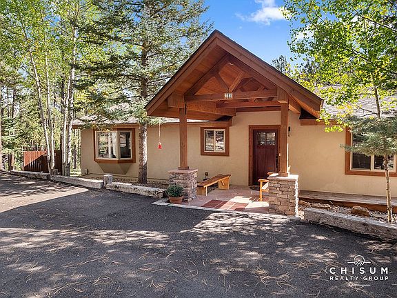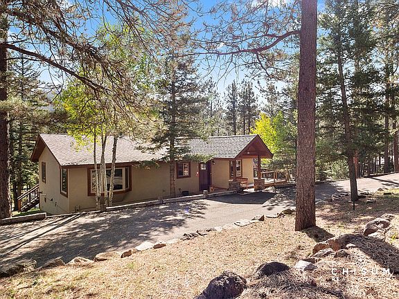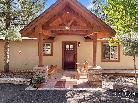 If you desire an all main-floor, beautifully finished, well-maintained home, look no further than 13 Oakmont Terrace. This home was remodeled in 2013. As you enter the property, there is a drive-through paved driveway with easy access off 434. Walking down the covered stone entryway, there are minimal steps to the front door. Upon entry, you are greeted by the living room, boasting a rock fireplace, vaulted ceilings, and tongue-and-groove and beams highlighting the architecture. The kitchen has stainless steel appliances and granite countertops. The kitchen has a bar separating it from the living room, along with an island. The dining room is a comfortable nook adjacent to the kitchen. There is a large closet with washer/dryer stacked right off the dining nook. The master bedroom has an ensuite bathroom with a tile shower and granite vanity. The other two bedrooms share a Jack-and-Jill bathroom. Going outside, there is a large wrap around deck and a separate flagstone patio area perfect for grilling with an additional wood-burning fireplace. This home has not been in the rental pool so it feels welcoming and new. The home comes mostly furnished as well so please ask for an inclusion list. Look no further than this home for your next chapter in Angel Fire!