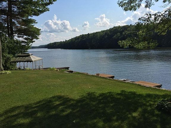 A waterfront paradise-with the best view on Cedar lake! Nearly 2 wooded acres and 250' of deep water waterfront, incredible privacy, an amazing oversize dock and sun deck you will never want to leave home. There is plenty of room for all your water craft on the dock with multiple slips. Enjoy the amazing sunsets from the dock, spacious new deck or the recently remodeled kitchen. The eat in kitchen has hickory cabinets, granite countertops and beautiful hardwood floors. The expansive remodeled living room has new windows, carpeting and adjoins the sun room- where you can continue your lake gazing. The spacious upstairs has four bedrooms and two bathrooms. The oversized attached two car garage is only the beginning-in addition there is a huge three car detached garage plus full stair access to the upper storage area. All roofs were replaced in 2015. Other features include an irrigation system and private boat ramp. The location is another huge plus-only minutes from the Mass Pike.