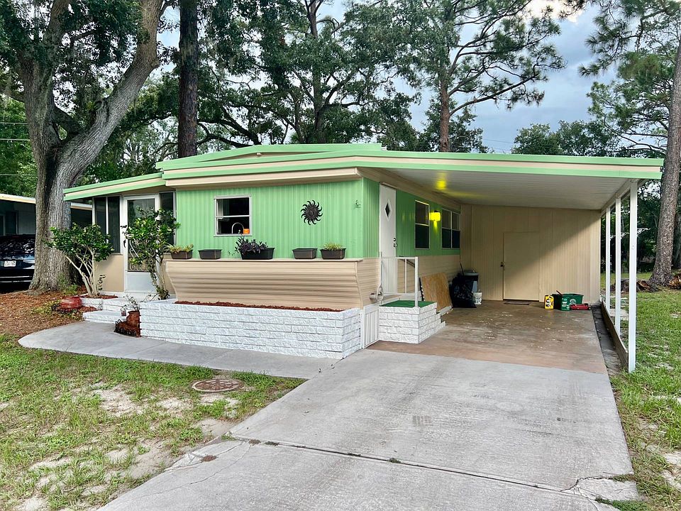 Welcome Home to your new place in Carriage Cove(55+)! This home has been wonderfully remodeled. All new kitchen with beautiful shaker cabinets, corian countertops and stainless steel appliances. In the newly open living area, you'll find a large space for your furniture and brand new carpet that carries through the bedrooms. The bathroom has a new vanity and vinyl floors. An added Florida room is perfect for cool weather or watching the afternoon thunderstorms. Out in the backyard, you'll experience a large "green" area. Call today to get more details and schedule a showing! Carriage Cove is an awesome 55+ community with many amenities such as a pool, spa, horseshoe area, shuffleboard court, billiard room, library and RV or boat storage.