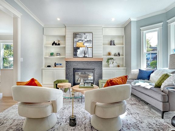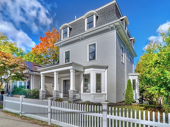 Prospect Hill neighborhood! Striking and Sophisticated restored + gutted Mansard Victorian. Open and Airy floor plan with exquisite moldings, gas fireplace, gorgeous chef's kitchen with high end appliances and large island with window seat and bar area flows onto the huge deck overlooking the treetop and seasonal skyline views. High ceilings with hardwood floors throughout this 3 story home. ***Primary suite with "spa" like designer bath and walk in closet*** Additional 2nd en-suite bedroom. Escape to the 3rd floor with two additional bedrooms and 3rd bath. Basement offers abundance of potential with high ceilings and walkout to the tremendous deep landscaped lot with irrigation. Off street parking for 2+ cars. Nothing to do but enjoy the high quality restorations with exquisite attention to detail! Close to all Roslindale Village has to offer including the commuter rail, Village Market, fabulous dining options and walk to Commuter Rail or bus to Forest Hill T.
