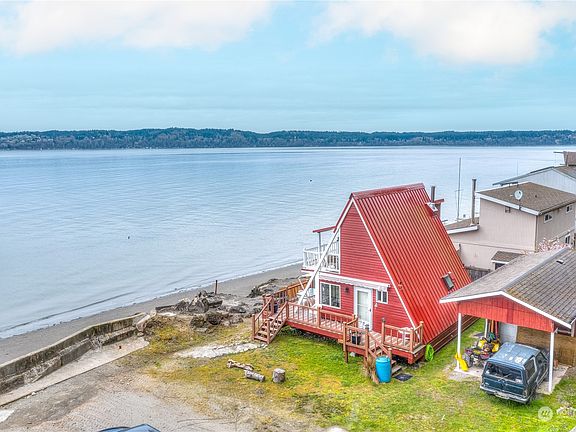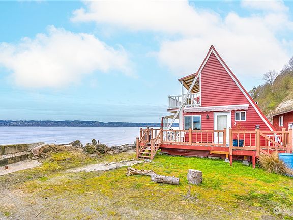 Beach home with unobstructed views of Puget Sound, ferries, mountains, including Mt. Rainier. Newly renovated charming waterfront A-frame on 89 feet of sandy beach on private island, with decks on both levels, a quick boat ride from Everett marina. Private access to seeded clam beds, shrimping, fishing, crabbing, mooring ball chain installed, professional bulkhead, and boat ramp. Home has metal roof and has been remodeled with brand new flooring, lighting, windows, sliding doors, deck rails, Sunbrella covers on decks, water heater, updated kitchen. Hat island boasts a 9-hole USGA golf course, community garden, summer concert series, returning eagle families, gray whales and orcas, trails, and so much more!