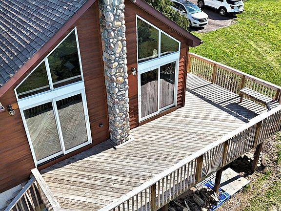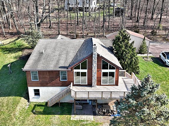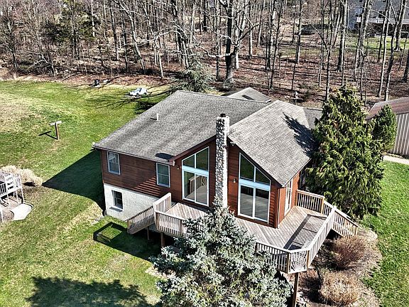 You will be singing "Country Roads Take Me Home" as you drive to this convenient yet tucked away home from the hustle and bustle to your private retreat. The long shared driveway leads to this A frame home with a panoramic view of a meadow with a wooded back drop for a foundation for amazing sunsets. Nature and wildlife abound. As you enter the house via the screened porch 13 x 16 with tile floor, ideal for outside dining and relaxing in the warmer days that are just around the corner, and nightfall comes will be serenaded by all the tree frogs. As you enter the home via the kitchen you can feel the warmth and know your home. There is an abundance of counter space and cabinetry for meal prep, with the stainless steel appliances. The room spills into the dining area, all open to allow for workspace, then into the living room. This room is the heart of the home, cathedral ceiling, and a window wall to enjoy the view of the meadow and woodland in the distance. Enjoy the deer, and other wildlife that frequent the neighborhood. The main bedroom has a private bath and walk in closet. Two other remaining bedrooms, hall bath and main level laundry and powder room compliment the main level. The lower level basement has a walk out door to a patio area under the deck. The two rooms, one mechanical and the other could be used for a workout area or whatever need you have for the space. The 2 car garage has an automatic door opener, electric with a 40 amp subpanel, with an additional storage shed 14 x 20 and covered area. There is an above ground pool and many fruit trees.