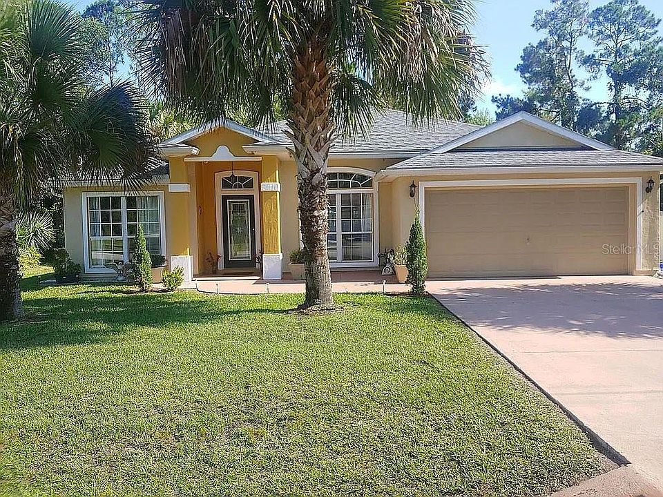 Home with pool/spa on good size lot. Private back yard with wooded scenery. High ceiling open floor plan.