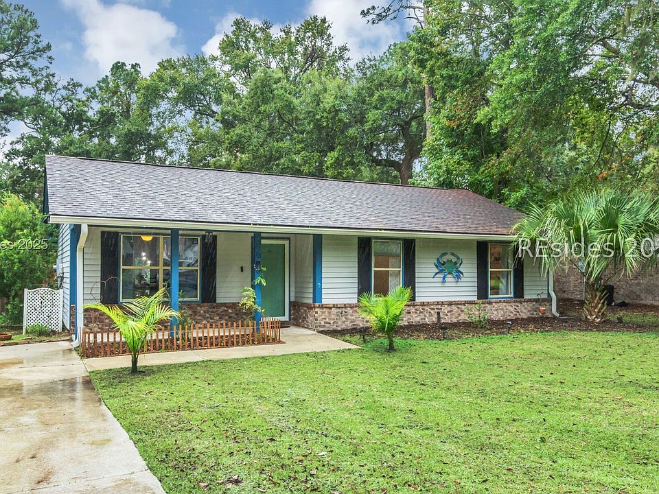 Tucked away in a peaceful setting on Ladys Island, this home sits on a generous lot while still being just minutes from parks, shops, and waterfront amenities. The living room overlooks the front yard, highlighted by custom barn doors across the windows. Distinctive stone and brick flooring through the dining room and kitchen adds a touch of character you won't find in other homes. Out back, the fenced yard is perfect for entertaining or giving your furry and feathered friends room to roam. Four orange trees, a cherry tree, and banana plants line the yard. Additionally, the large shed provides plenty of storage for tools, hobbies, or equipment. Best of all, this property offers the freedom to enjoy the Lowcountry lifestyle without the restrictions of HOAs or covenants.
