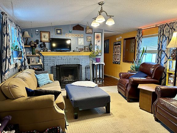 2 Bed 1 bath home with a fenced in yard area, and additional yard space with gardens and a large stack of wood all ready to go for the fireplace. Inside you have an open kitchen living space with a cozy working wood fireplace. Notice the built-in shelves near the big front window for plants & other storage uses! This home is close to town & schools. Water, sewer & trash included in the park fee!