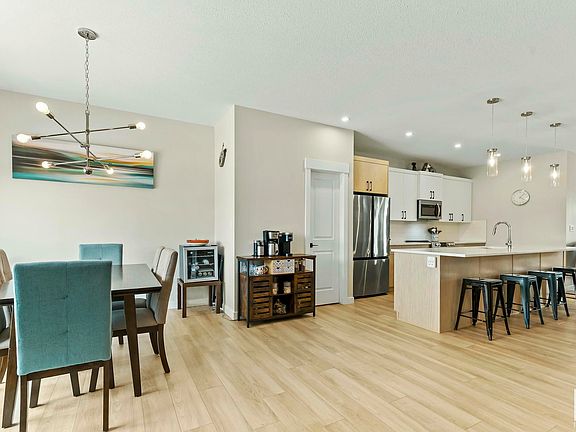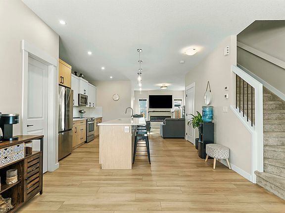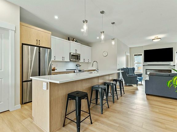 Step inside this fantastic almost-new home and be WOWED! The main floor offers an open concept with 9' ceilings, beautiful vinyl plank flooring +a seamless flow throughout. The kitchen features sleek quartz countertops, a mixture of white and wood grained 42 cabinets, a massive island w/seating for SIX, large dining room, and sunny living room complete with a fireplace to cozy up to! Upstairs, three bedrooms await, including a primary suite with a walk-in closet and ensuite bath, and the noteworthy upstairs laundry adds an element of practicality. The unfinished basement offers 9' ceilings and its own separate entrance; ready for your personalization. Outside, enjoy the low-maintenance, backyard with TWO professionally-built decks, perfect for outdoor entertaining as well as a double detached & insulated garage. It's fully fenced & landscaped and comes with custom blinds too! Located close to shops, trails & schools, and offers a lifestyle of convenience and comfort that's hard to resist- just move in!