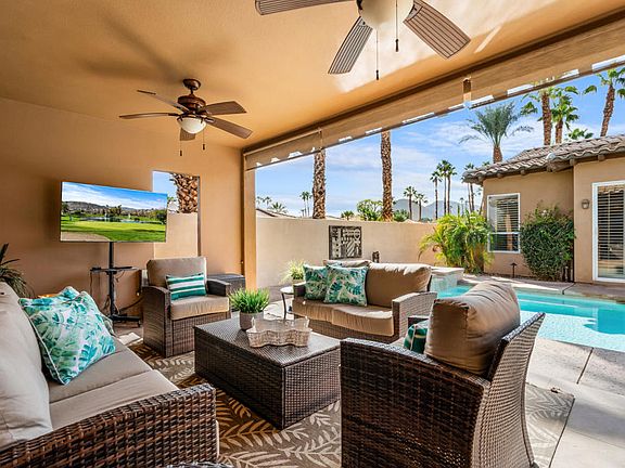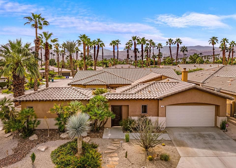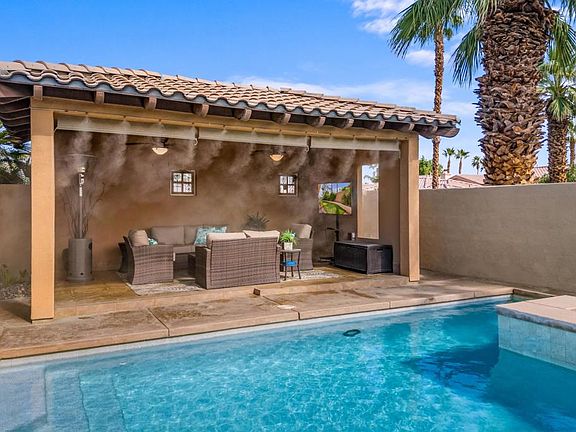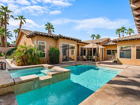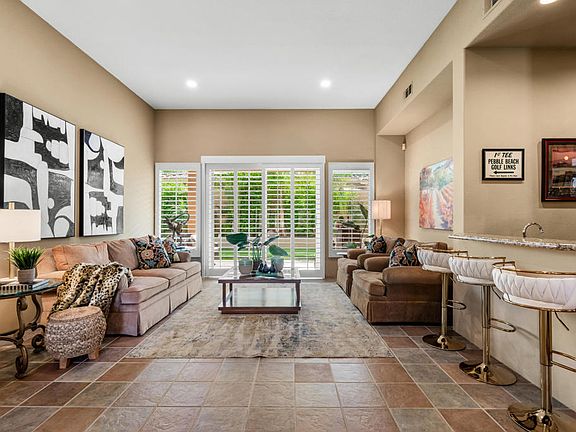 Welcome to Palmira, a sought-after gated enclave celebrated for its privacy, charm, and prime Palm Desert location. This beautifully crafted Plan Three residence features five bedrooms, one is currently used as an office, and three-and-a-half-baths, offering generous living spaces designed for effortless desert living. Soaring ceilings, granite slab surfaces, and refined finishes of tile and plush carpeting lend a timeless warmth to the interiors, while expansive glass doors dissolve the boundary between indoors and out. The formal living room opens to a gracious wet bar and a wall of sliding glass doors, filling the space with natural light and seamless views to the private courtyard and pool. An adjacent formal dining room lends itself to elegant entertaining, while the open-concept kitchen and family room combine for relaxed everyday comfort; complete with a center island, breakfast bar seating, fireplace, and casual dining area that connects directly to the patio. Outdoors, the north-facing courtyard offers resort-style living with a sparkling pool and spa, covered patio with ceiling fans and misters, plus a guest casita, perfect for hosting family and friends. Lush landscaping ensures privacy and tranquility, framing every view in desert beauty. Perfect as a full-time residence or seasonal escape, this home embodies comfort, craftsmanship, and convenience, just moments from El Paseo's boutiques, fine dining, and world-class golf.