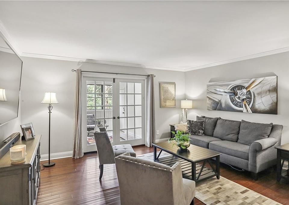 Welcome home to a fully renovated 2 bed, 2 bath plus a light-filled sunroom that is a perfect home office/flex space! Beautiful, engineered hardwoods throughout-no carpet! Kitchen wall was removed for 100% open floor plan to dining room, living room & sunroom. Granite, white cabinetry, stainless appliances, & new tile floor. Both sparkling white bathrooms have marble-topped vanities, new lighting, fixtures & flooring. Oversized floor tile in primary bath enhances the room visually! The HVAC is 5 yrs old. The backyard is shared and landscaped with greenery and slate chips-great for Fido! Cross Creek is a 24-hour, (operated by a human gate attendant) GATED community in the heart of Buckhead's westside. Amenities include: an 18-hole, par-3 golf course with pro-shop, 3 swimming pools (the main pool has a life-guard from May-September) and the other two feature renovated clubhouses. 4 tennis courts with 2 striped for pickle ball, a gym, restaurant and bar, on-site HOA office, and walking lanes down the parkway! Sited on over 110 acres of natural landscaping, you literally are in a hidden forest just minutes to Buckhead nightlife & business district, Midtown, Downtown and an easy 15 minutes to the airport! HOA fee includes: Water, Sewer, Trash, Roof, Exterior Maintenance, Landscaping, Pools & Tennis and more!