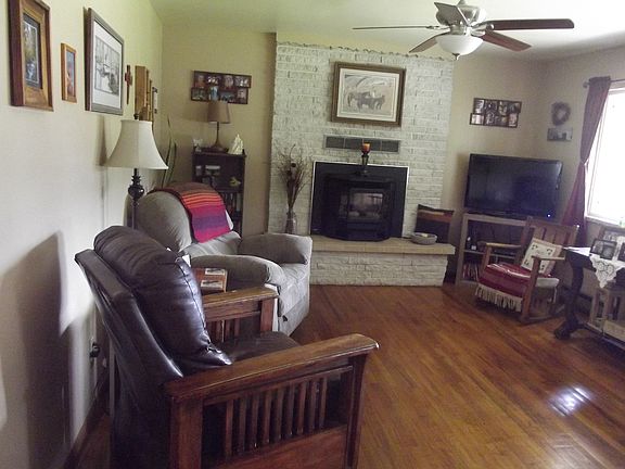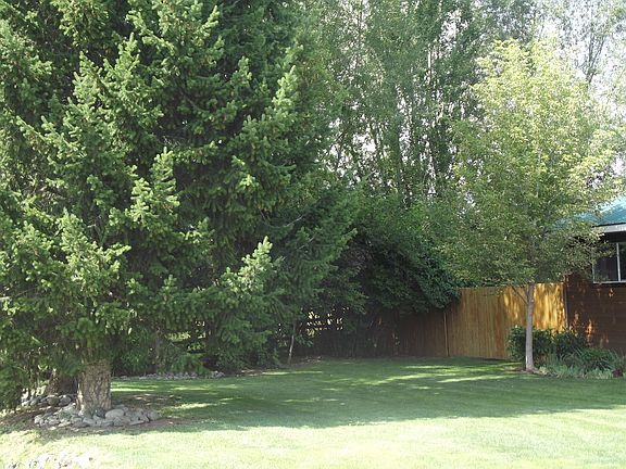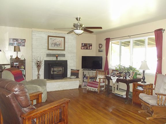 Three bedroom, one bath, ranch style home with detached 2 car garage and storage building. Site is approximately .5+ acres and has irrigation water right and new privacy fencing. Home has metal roof and vinyl windows. New siding on home and garage, covered front porch and block patio. Pellet stove insert in living room fireplace and newly remodeled bathroom. Large back yard featuring a gazebo, fire pit and large garden area. Property has pear, cherry, apple and plum trees.