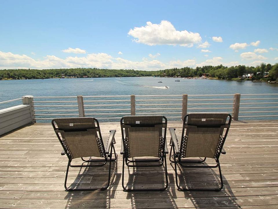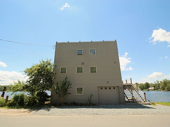 Contemporary, multi-level, lakefront home just a half mile from the appealing hamlet of Kauneonga Lake. The ground floor features a bedroom that has been converted to an office, a full bathroom, and a space that had once been a one car garage that is now used as a gym. Could be a den or other use. That space opens to the sandy waterfront out back. Wide exterior stairs lead to the primary living spaces on the second floor. The open plan space features a lot of windows and a set of French doors, all oriented to the panoramic view of White Lake. The large kitchen area, with plenty of cabinetry, is well-designed for entertaining, with generous space for a large table in the dining area. The sun-drenched lounge area is by the French doors, which open onto a 500+ square foot deck overlooking the lake. A screened porch is accessed via a different door, and is a popular spot for summertime dining and hanging out. Upstairs to the third floor, the 350 sf space has been opened to a large single bedroom, which opens again to its own private 540 sf deck. A walk to town is rewarded with multiple waterfront dining options with live music.