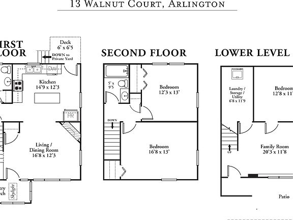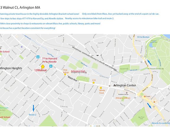 Stunning private townhouse in the highly desirable Arlington Brackett school zone! Only one block from Mass. Ave. yet tucked away at the end of a quiet cul-de-sac, this 3 level town house (built in 1987) is in impeccable condition and has the feel and function of a single family home. 2-3 oversized bedrooms, 1.5 bath, 2 deeded parking spaces, private backyard and patio. A true "walk out" basement used as the 3rd bedroom and family room, has full sized windows, lots of light and extra storage. First floor features the dining room, and the newly renovated and stylish kitchen with granite countertops and an island, equipped with top brand appliances. Two main bedrooms on the second floor are spacious with excellent closet space.This pristine house is perfectly located. Walks to shops, restaurants, award winning public schools, as well as bus stops #77 #79 to Harvard Sq. and Alewife, proximity to minuteman bike trail and route 2. A truly rare find! Open Houses Fri. Sat. Sun (11:30-1:30).