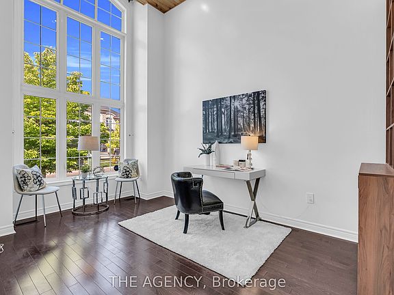 Soaring open-to-above foyerDesigner chandelierMain floor officeWood plank ceilingPot lightsElegant dining roomChef-inspired kitchen