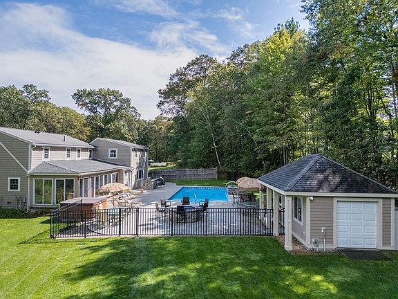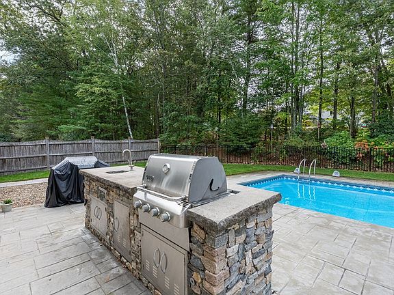 Welcome home to 13 Westgate! This updated home has radiant heat throughout, High velocity Central Air and 200 Amp service. Updated custom kitchen and 3 baths are just the start. Home security camera system and heated garage with work space. Kitchen has high end stainless appliances including gas range with hood vent, full size refrigerator, dishwasher, Pot Filler and included washer and dryer. Great room has lots of natural light and a loft area perfect for entertaining, game area or workout space.Stone walls, stamped patio surrounding in-ground pool with numerous water features. Pool house, , 2 gas fire features, outside grill, kitchenette and beautiful lawn and grounds! A MUST SEE!
