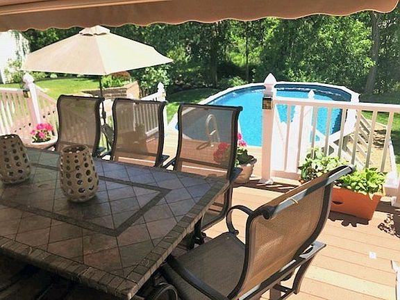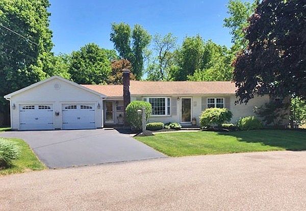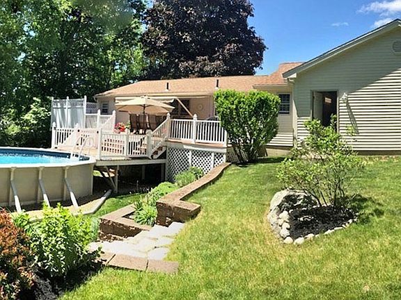 Talk about move-in condition!! Beautiful hardwoods, crown moldings, updated kitchen & baths with quartz countertops. Home was originally 3 bedrooms but homeowner opened up the Living Room wall to make a gorgeous Dining Room (easily converted back if you need three bedrooms). Living Room has a wood burning fireplace, built-in bookcases & bay window. Both bedrooms have hardwood flooring & double closets. In the Lower Level we find a finished Family Room & Office with wall to wall carpeting. Half bath & Laundry hookups are here also. Hot Water Baseboard heating system on 2 zones was installed in 2004 & oil tank is new. 200 Amp electric service in the basement & a second panel in the oversized two car garage for generator hookup. On the exterior, siding was painted less than 2 years ago & gutters are installed. Lawn is irrigated. Large deck with awning & outdoor speakers leads to the oval shaped Above-Ground Pool. Electricity in the shed. Flower beds both sides. Town water & sewer.