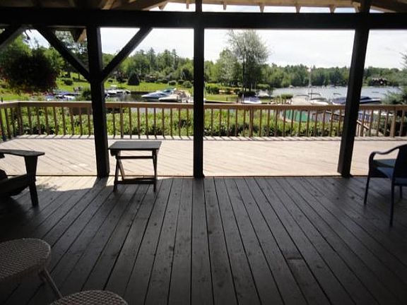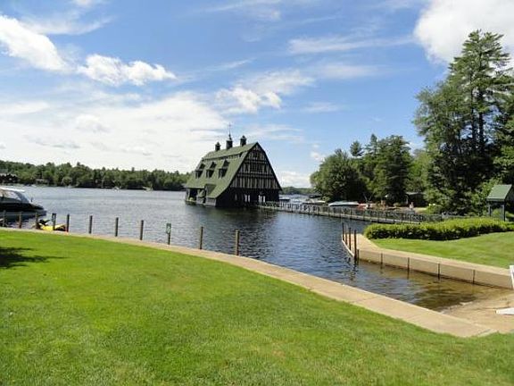 Lovely waterfront condo at Windward Harbor with panoramic view of historic Swallow Boathouse and peaceful cove on Lake Winnipesaukee. Steps to private sandy beach, canoe racks, tennis courts and deeded boat slip #12 in a protected marina for a boat up to 26'. Architectural living space features an open concept design with two-story cathedral living room, two spacious bedrooms plus large loft, heated four-season porch, wrap-around deck and updated kitchen and baths. The light-filled space features replacement windows throughout. Recipient of the Builders' Choice Award, Windward Harbor is an exceptionally beautiful community with sweeping lawns and manicured landscaping. Bonus: Includes two Old Town Pathfinder canoes with oars and cushions and a two-seater Pelican paddleboat with cover. Oversized one car garage. Two refrigerators.