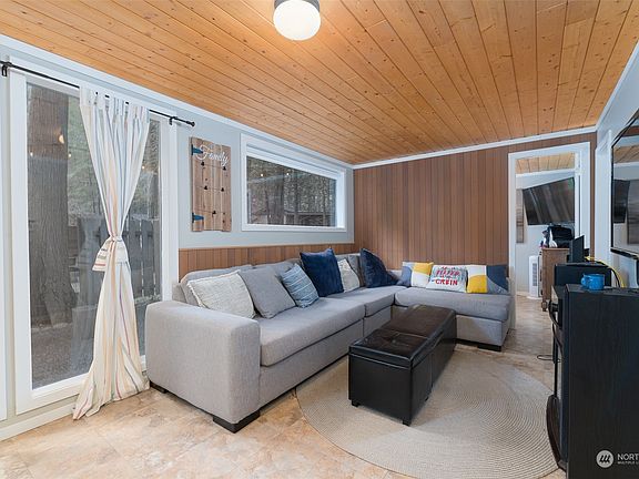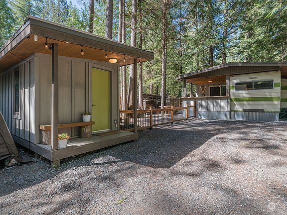 This meticulously maintained property embodies craftsmanship and detail in the scenic Glen at Maple Falls. A trailer with two additional rooms-a large but cozy living room and 2nd bedroom, along with a separate bunkhouse, comfortably accommodates up to 8 guests with 4 double beds. Its pristine condition speaks volumes about the care it has received over the years. New water heater, new toilet, new gravel. Built-in BBQ & mini fridge on the inviting covered front porch & beautiful fully fenced yard area. Turnkey-just enjoy! Zoned recreational for 120 days of use per year and has all the amenities you could want, including 2 pools, a hot tub, sports courts, a library, a laundromat, 2 clubhouses, 24-hour security/gated, & playgrounds.