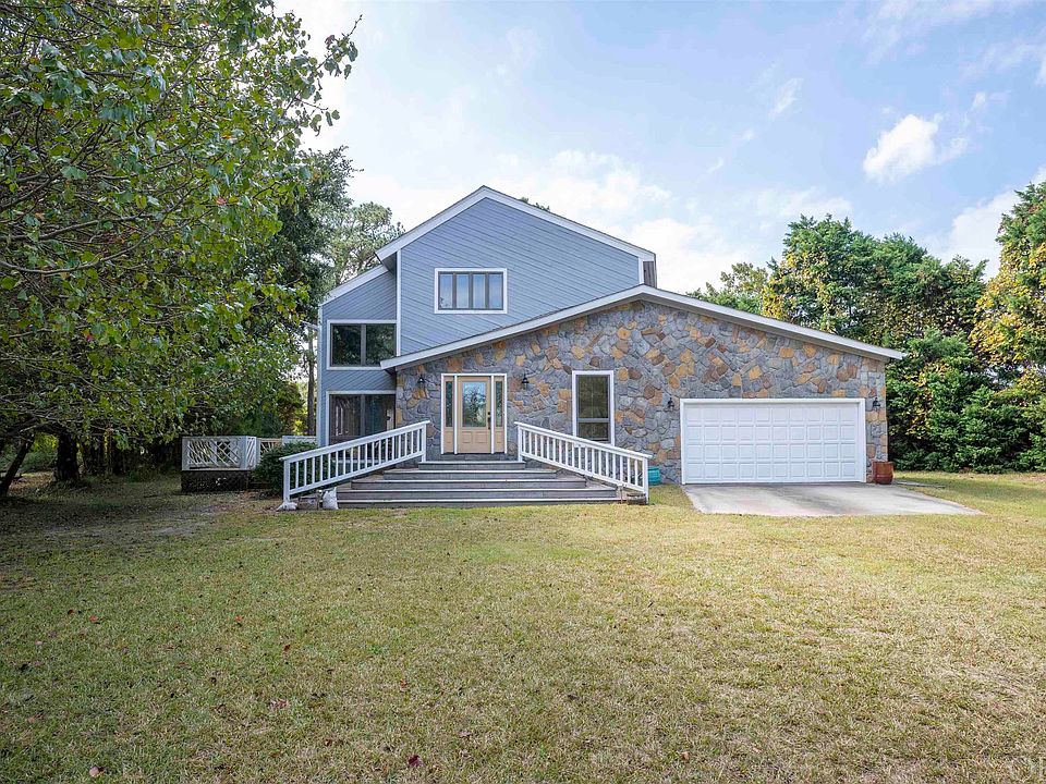 Located just west of the Wright Memorial Bridge, this property offers the best of both worlds: convenient access to the beach in a secluded country setting! This 3BR / 2BA home is just waiting for a touch of creativity to maximize its features and bring it back to life. Upon entering the main level, you'll find a large sunken living area with vaulted ceilings and a massive stone hearth with a lodge-like feel. The combined kitchen and dining area connect to an enclosed sun porch, as well as a spacious sun deck with views of open fields perfect for observing birds and wildlife. Through the kitchen, you'll enter the laundry and pantry en route to an attached garage. You'll also find a conveniently-located bedroom and hall bath on this level. Head upstairs and you'll find two bedrooms (one massive, the other smaller but perfect for a home office), along with a shared bath all connected by a catwalk-style hallway that opens out over the living area. Located at the end of a quiet cul-de-sac, with deeded community soundfront area, this home has lots of potential and is begging for a fresh start. Come see this property for yourself and get your creative juices flowing today!