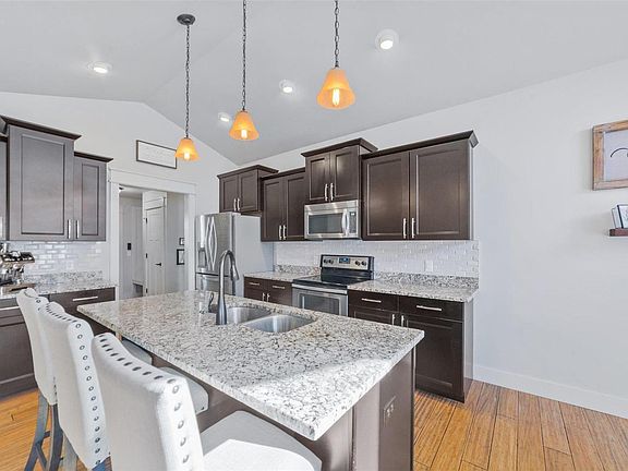 Welcome home to this 3 bed, 2 bath ranch that features an open concept floor plan loaded with custom finishes! Inside you are greeted with bamboo hardwood floors and tall baseboards that run throughout the main living areas. The chef's kitchen is a dream with a vaulted ceiling, large island, granite countertops, staggered cabinetry, ss appliances and a pantry. Off the kitchen is the breakfast room with transom windows and sliding doors that lead to the fully (vinyl) fenced backyard and large patio! The cozy living room boasts wood beams across the ceiling and a stone fireplace (gas) with a mantle. Retreat to the master suite with a tray ceiling, custom crown molding and luxury en-suite bathroom featuring double sinks, jacuzzi tub, glass shower and walk in closet. Two spacious bedrooms, main floor laundry and built-in cubbies off the 3 car garage complete the main level. The staircase with wrought iron spindles leads to the unfinished basement perfect for storage or future living space.