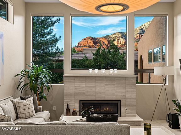 Gorgeous newly remodeled townhome with luxury appointments throughout and incredible views of Thunder Mountain. Premier lot with large wrap-around private patio, outdoor kiva fireplace, and a red rock backdrop for the serene lifestyle you seek. New custom gas fireplace in the living room and a second fireplace in the owners bedroom suite. This incredibly desirable floor-plan offers two bedroom/bathroom en-suites with patio access. Bonus office (or 3rd bedroom) with custom built-in office storage and private atrium patio. Half bath included with laundry. Two car garage with epoxy floors & abundance of storage. Owner has new HVAC, remodeled kitchen with new appliances, new bathrooms, new carpet in bedrooms, and more! Walkable, well-maintained community with private pool area.