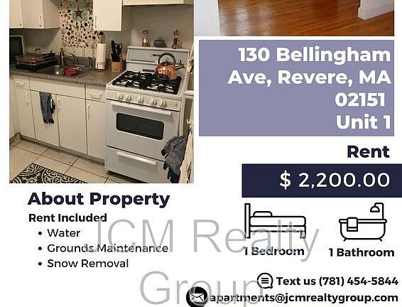 Property located at 130 Bellingham Ave, U-1, Revere, MA 02151, available starting February 1st. This apartment features 1 bedroom and 1 bathroom. Utilities included are water, grounds maintenance, and snow removal. Utilities not included are electricity and gas (for cooking). Amenities include street parking, laundry in the building, refrigerator, and gas stove. Rental Terms: Rent: $2,200.00 Security Deposit: $2,200.00 No Last Month's Broker Fee: $2,200.00 Utilities Included: Water Grounds Maintenance Snow Removal Utilities Not Included: Electricity Gas (Cooking) Amenities: Parking: Street Parking Laundry: In the building Heating: Gas Appliances: Refrigerator: [Yes] Stove: [Yes] Gas Pet Policy: Cats Allowed Dogs Allowed