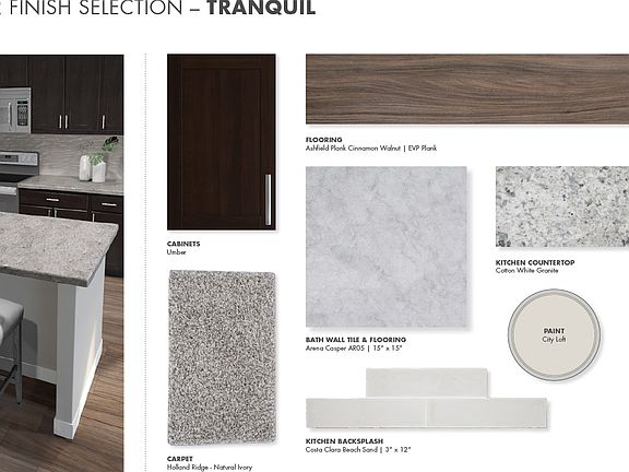 The kitchen's large island and the great room's fireplace make this the perfect place for gathering with family and friends. Umber cabinets with cotton white granite countertops, reddish-brown EVP flooring & carpet in our Tranquil package.