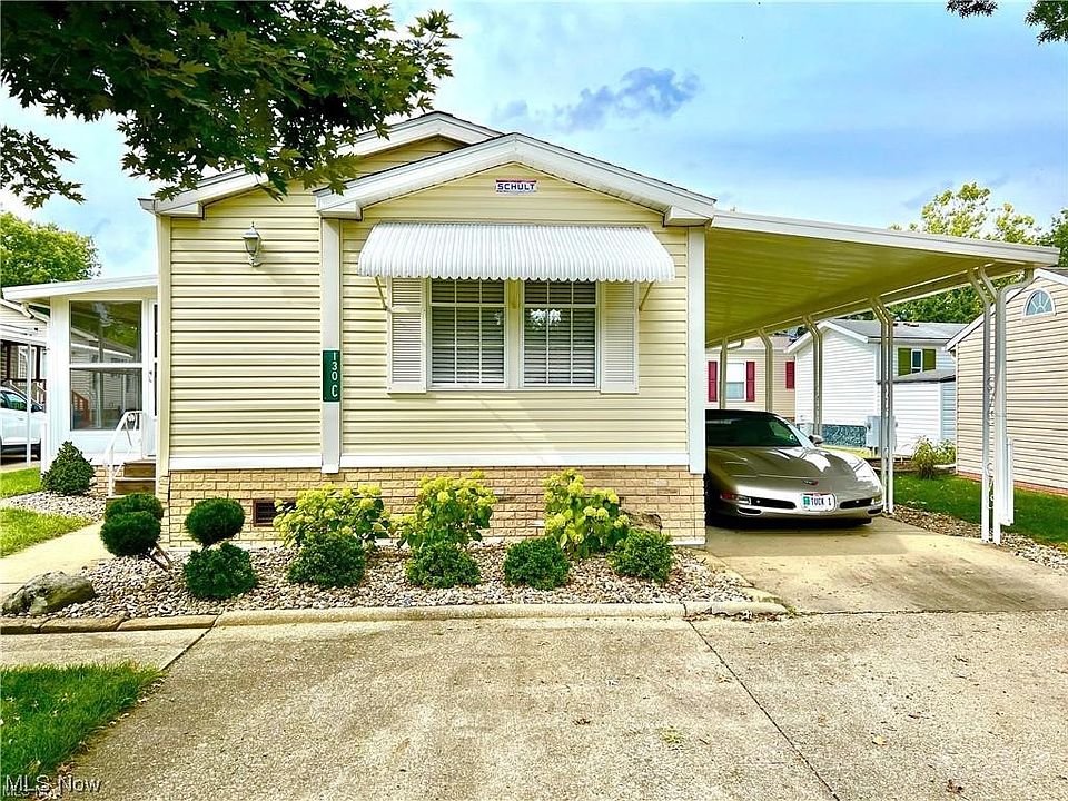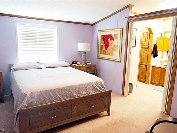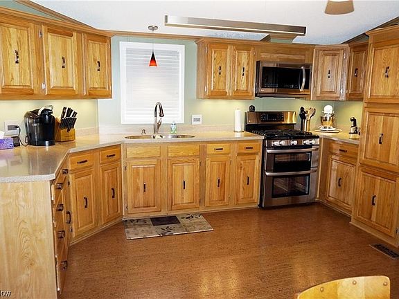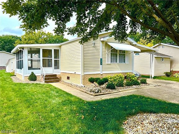Better than NEW, pristine and very well kept, 1232 square foot Schult double-wide mobile home is for sale in the lovely 55+ Community of Navarre Village. This spacious 2 Bedroom, 2 Bath, 2-stahl attached Carport, 2 Shed property has clean soft-yellow and white vinyl siding and skirting. The Home has 200-amp service. Enjoy the beautiful, low maintenance, 9 ft x 18 ft enclosed Patio with friends and family. Enter into the Living Room with high ceilings and newer easy-on-the feet cork flooring ‘15 which spreads into the Eat-In Kitchen making the Home feel nice and large. The 15 ft x 15 ft Eat-In Kitchen has gorgeous newer neutral Corian counter tops, sink, handles, hinges, lights, flooring and gas stove ‘15. The Owner’s En Suite has Cathedral Ceilings and a corner garden tub, as well as, a walk-in shower. The Owner’s Bedroom is large enough to fit a king size bed and has a roomy walk-in closet. The Second Bedroom can also make a great office. The 2nd Bathroom is completely updated ‘22 and