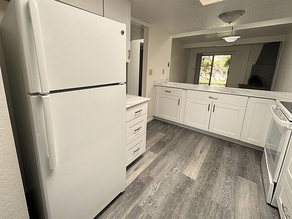 Fully renovated 2 bedroom 2 bathroom condo in beautiful Village of Oak Creek. Bright and cheery unit with wood inspired luxury vinyl flooring throughout. Fresh paint, fully updated bathrooms and kitchen, and newer appliances. Wood burning kiva fireplace in the open concept living room and kitchen area with a washer and dryer off the kitchen with a large pantry. Both bedrooms have large closets and ceiling fans. The master bathroom has a tub and guest bathroom has walk-in shower. Front patio and access to the back patio via sliding glass doors from both the living room and second bedroom. Each patio has an exterior storage closet for additional storage space. There are 2 assigned parking spaces. 2 car maximum per unit. No oversized or commercial vehicles permitted in this complex. Conveniently located close to shopping, dining, golf courses, and trails. Sorry, no pets.