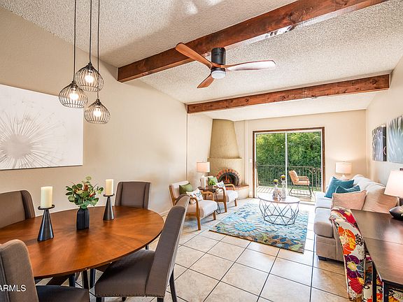 his inviting single-level 2 BR 2 BA townhome boasts 1034 sq. ft., comfy layout & pleasant setting. The kitchen features: new: dishwasher, range, vent hood, disposal, sink & faucet plus abundant cabinetry & breakfast bar. The LR/DR highlights: vaulted ceilings, ceiling fan & a wood burning kiva style FP. Sliding glass doors access the rear patio, from the LR & guest BR - which takes in the vibrant greenery. The primary suite includes - ceiling fan, closet & en-suite bath. Additional updates include - gorgeous hall bath, interior paint, ceiling fans, bath fixtures, vanity lights, DR chandelier & freshly painted front patio. Both patios include a storage closet & 2 parking spaces. Great restaurants, shopping, hiking & biking nearby! Experience the sweet ambiance of uncomplicated living.