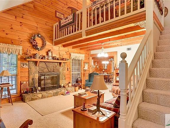 This beautiful country style log home has a lot to offer. This 3 Bedroom home features the main floor master bedroom with master bathroom, a beautiful country kitchen, a large fining area, and unique wood burning fireplace. Upstairs there are two bedrooms and a large loft with a wet bar. Make your way outdoors to enjoy your multiple porches, one being a screened in porch. Cool nights? Warm yourself by1 of the 2 fire pit locations in your large back yard while frilling on your wood burning BBQ pit. A detached garage features a large in-law suit with a living room, bathroom, bedroom, and unfinished kitchen. Don't miss out on this incredible home. This home has been featured on several magazines to include Better Homes and Gardens and Southern Living.