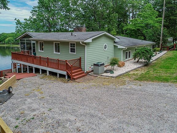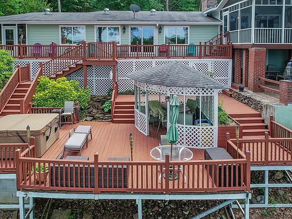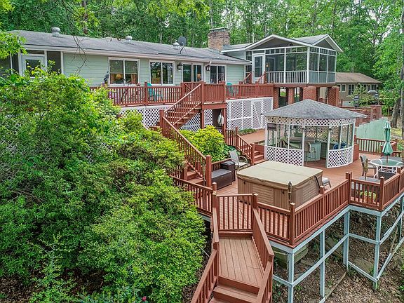 Beautiful well maintained Lake home with outstanding main lake and large cove water views. As you walk in, this home gives you the English tavern-Williamsburg feeling on Lake Gaston. Home features 3 bedrooms, 1 designated that's being used as a 4th bedroom, 3 full baths, 3 wood burning fire places, replacement windows, 2 lakeside screen porches, covered lakeside brick patio, lakeside decking, tiki bar w/granite top and new hot tub (see list of other improvements under documents). Property has a double enclosed boathouse with storage and sun deck. Excellent water depth at approximately 14' Also has two electric boat lifts and 1 jet ski lift. There's a new rock fire pit with setting area to entertain your family and friends. Majority of home furnishings will convey with acceptable offer.