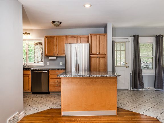 Step inside to a bright and welcoming first floor, where natural light fills the living room with hardwood floors and an electric fireplace. The kitchen features granite countertops, ceramic tile flooring, and newer appliances including a refrigerator, dishwasher, and hood vent. A spacious dining area, two bedrooms, and a full bath complete the main level.