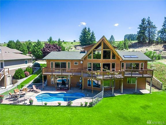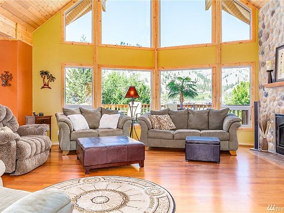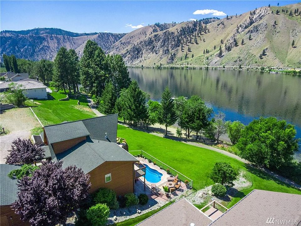 Sunny low bank Waterfront home with sandy beach and private swimming pool. Large dock with assigned boat slip and guest slips. Stamped concrete patio, outdoor sound system, new deck and beautiful Mountain & River views! Soaring vaulted ceilings in great room with fireplace and open kitchen with Center Island. Main floor master suite plus second main floor bedroom. Daylight basement with bar kitchen for entertaining. Two large bedrooms with room to frame closets, family room and bonus room.